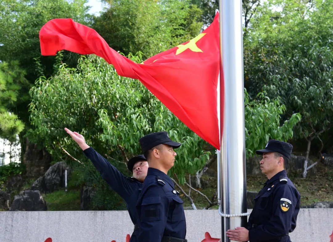 上午9時(shí),三名旗手邁著整齊矯健的步伐,護(hù)衛(wèi)著國旗入場(chǎng),伴隨著雄壯的國歌,鮮艷的五星紅旗冉冉升起,迎風(fēng)飄揚(yáng)。參加儀式的全體人員在升旗臺(tái)前列隊(duì)整齊、肅穆而立,面向國旗莊嚴(yán)行禮,共同祝愿?jìng)ゴ笞鎳臃睒s昌盛!祝愿國聯(lián)保安更加壯大輝煌!祝愿全體員工更加幸福美滿!