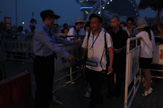 圖為:開(kāi)幕式正式開(kāi)始前,各出入口隊(duì)員做好安檢工作