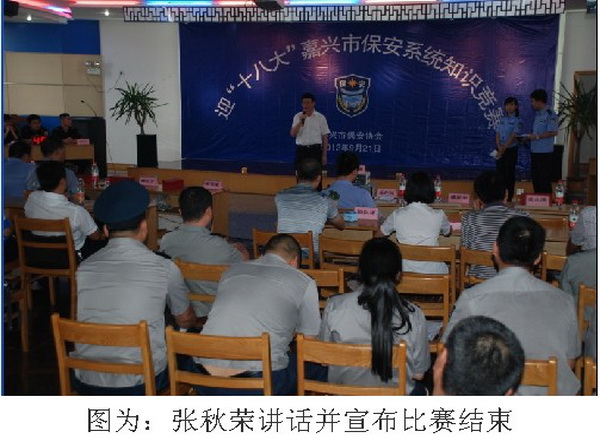 浙江省保安工作消息 為迎接黨的“十八大”順利召開,9月21日下午,浙江省嘉興市保安協(xié)會(huì)在嘉興市公安局人民警察培訓(xùn)學(xué)校舉辦了全市“保安系統(tǒng)知識(shí)競(jìng)賽”。省公安廳治安總隊(duì)保安科科長(zhǎng)、省保安協(xié)會(huì)秘書長(zhǎng)傅志方,省公安廳治安總隊(duì)保安科壽俊杰,市保安協(xié)會(huì)常務(wù)副會(huì)長(zhǎng)兼秘書長(zhǎng)張秋榮,市保安服務(wù)公司總經(jīng)理、市保安協(xié)會(huì)副會(huì)長(zhǎng)皇甫玉明等領(lǐng)導(dǎo)蒞臨現(xiàn)場(chǎng)觀摩指導(dǎo)。嘉興市公安局治安支隊(duì)政委潘新華和治安支隊(duì)副支隊(duì)長(zhǎng)朱忠華分別致了比賽開幕詞和閉幕詞。由市局特警支隊(duì)政委陸永清等四人組成的評(píng)委團(tuán)對(duì)比賽全程進(jìn)行了監(jiān)督、評(píng)判。