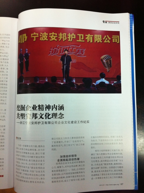 2012年,寧波安邦護(hù)衛(wèi)有限公司通過(guò)開(kāi)設(shè)“建設(shè)優(yōu)秀的企業(yè)文化”專(zhuān)題講座、刊發(fā)“企業(yè)文化建設(shè)專(zhuān)輯”、組織安邦文化核心價(jià)值觀討論、征集企業(yè)名片(口號(hào))、舉辦隊(duì)列會(huì)操和演講比賽等活動(dòng),著力推進(jìn)企業(yè)文化建設(shè),顯著提升公司軟實(shí)力、核心競(jìng)爭(zhēng)力和員工整體素質(zhì),取得了一定成效。2013年1月,今年第1期《中國(guó)保安》(總第279期)雜志 “保安企業(yè)文化”專(zhuān)題欄目刊登《挖掘企業(yè)精神內(nèi)涵,共塑安邦文化理念——浙江寧波安邦護(hù)衛(wèi)有限公司企業(yè)文化建設(shè)工作紀(jì)實(shí)》,對(duì)寧波安邦護(hù)衛(wèi)有限公司企業(yè)文化建設(shè)情況進(jìn)行了報(bào)道,進(jìn)一步擴(kuò)大了公司的行業(yè)知名度和社會(huì)影響力。