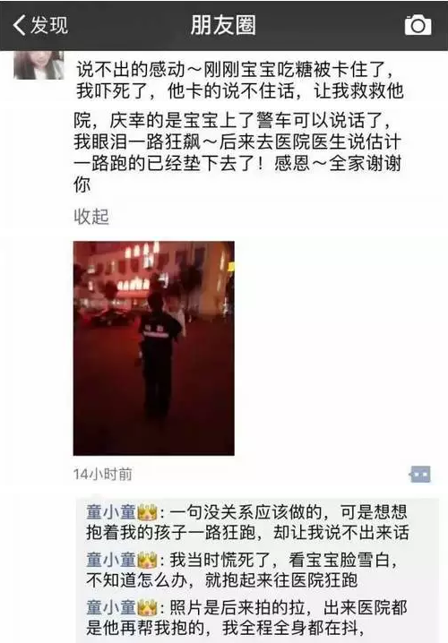 這個(gè)就是那條求助信息,照片中一名特勤隊(duì)員緊緊的抱著一個(gè)孩子。發(fā)布人童女士對(duì)照片描述大意是:孩子被糖果卡住了情況危急,情急之下一名巡邏的特勤隊(duì)員抱起孩子第一時(shí)間趕到了醫(yī)院,孩子轉(zhuǎn)危為安。她很希望找到這個(gè)好心的特勤隊(duì)員。