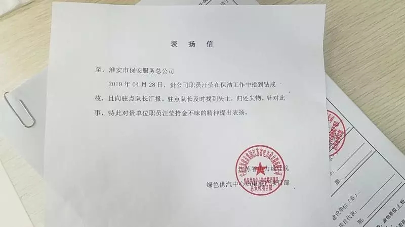 2019年5月1日,駐外分公司收到來(lái)自中國(guó)能源建設(shè)集團(tuán)江蘇省電力設(shè)計(jì)院有限公司發(fā)來(lái)的表?yè)P(yáng)信,感謝淮安保安駐江蘇省電力設(shè)計(jì)院有限公司隊(duì)員汪瑩在4月28日的保潔工作中拾金不昧,撿到鉆戒后立即向隊(duì)長(zhǎng)匯報(bào),駐點(diǎn)隊(duì)長(zhǎng)及時(shí)通報(bào)客戶單位并采取相應(yīng)措施聯(lián)系到失主,歸還失物。失主非常感謝汪瑩,客戶單位對(duì)淮安保安派駐的保潔員汪瑩同志拾金不昧的精神提出了表?yè)P(yáng),對(duì)淮安保安進(jìn)駐后的工作也表示認(rèn)可!