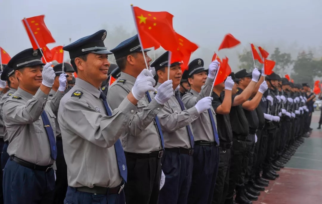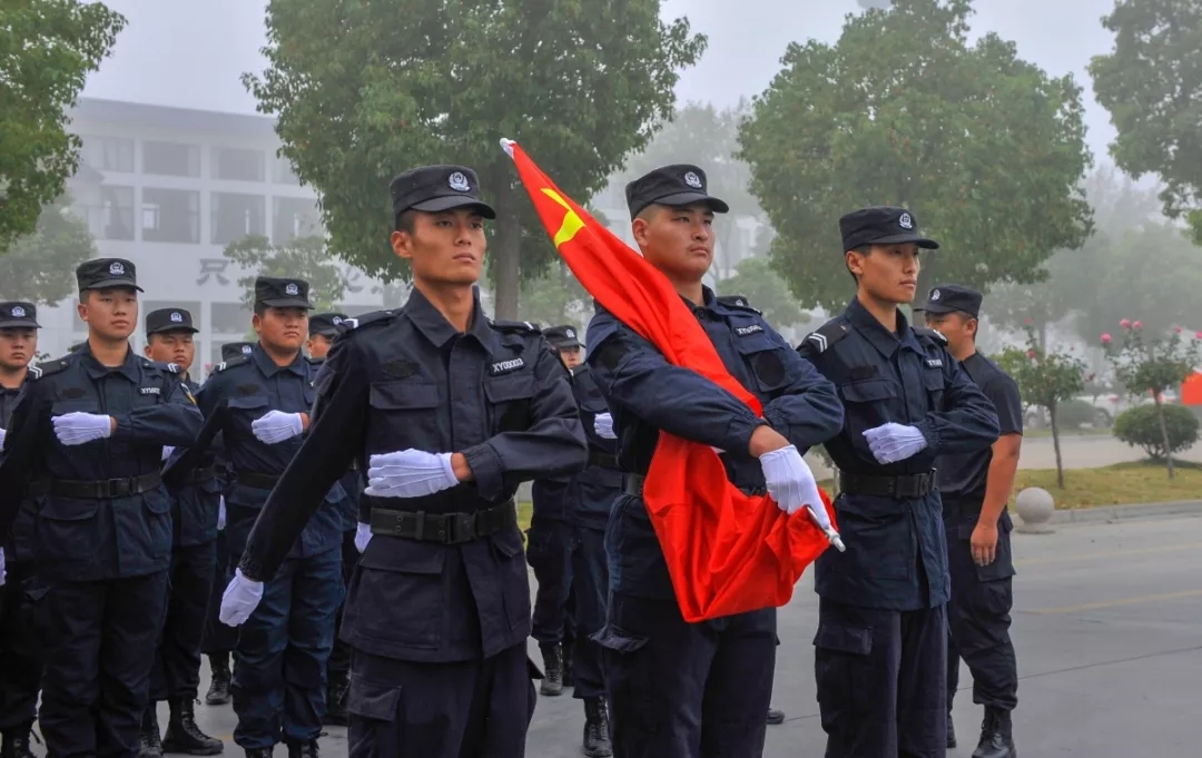 上午6時28分,升旗儀式正式開始。一名旗手、兩名護旗手及10余名保安班學員方隊邁著整齊的步伐,護送國旗正步走到升旗臺,伴隨著雄壯的國歌聲響起,徐徐將鮮艷的五星紅旗冉冉升起??偣驹趫龅母刹柯毠ぴ谏炫_前隊列整齊、肅穆而立,滿懷敬意地向國旗行注目禮,齊聲高唱國歌,獻上對祖國最深、最美好的祝福。