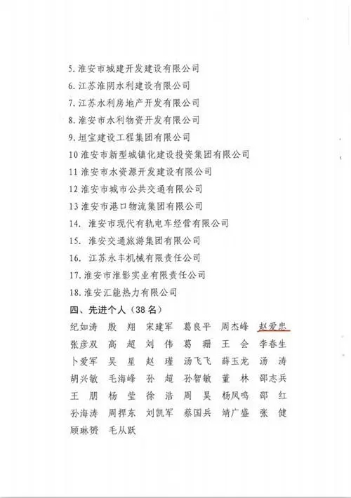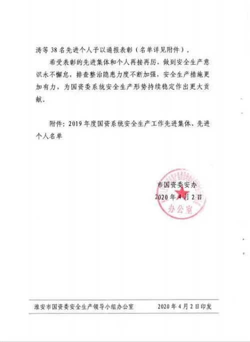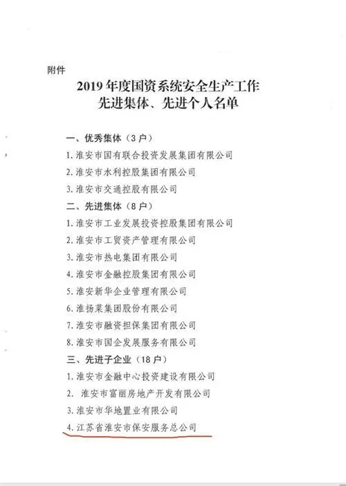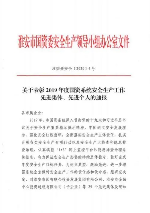 2020年4月2日,淮安市國資委通報表揚2019年度國資系統(tǒng)安全生產(chǎn)先進(jìn)集體和個人,淮安保安以“零事故”“零隱患”表現(xiàn)榮膺先進(jìn)集體。公司黨總支書記、總經(jīng)理趙愛忠榮膺先進(jìn)個人。