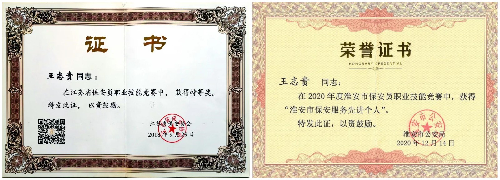押運(yùn)車(chē)長(zhǎng)王志貴同志,本科學(xué)歷,中共黨員,保安員國(guó)家職業(yè)技能等級(jí)二級(jí),保安技師資格證。工作十幾年來(lái),他始終保持軍人本色,服從命令,聽(tīng)從指揮,愛(ài)崗敬業(yè),不斷挖掘自己的內(nèi)在潛能,多次參加省、市保安職業(yè)技能大賽,先后榮獲省、市數(shù)次獎(jiǎng)項(xiàng):2018年度,在江蘇省保安職業(yè)技能競(jìng)賽中,獲得“特等獎(jiǎng)”,被授予“江蘇省技術(shù)能手稱(chēng)號(hào)”,被總公司評(píng)為“十佳保安”;2019年度,被總公司評(píng)為“優(yōu)秀車(chē)長(zhǎng)”、“押運(yùn)紅旗車(chē)組”;2020年度,被授予“江蘇省技術(shù)能手”、“江蘇省五一創(chuàng)新能手”、“江蘇省青年崗位能手”、“淮安市青年崗位能手”、“淮安市技術(shù)能手”、“淮安市五一創(chuàng)新能手” 等榮譽(yù)稱(chēng)號(hào),被淮安市公安局評(píng)為“淮安市保安服務(wù)先進(jìn)個(gè)人”。