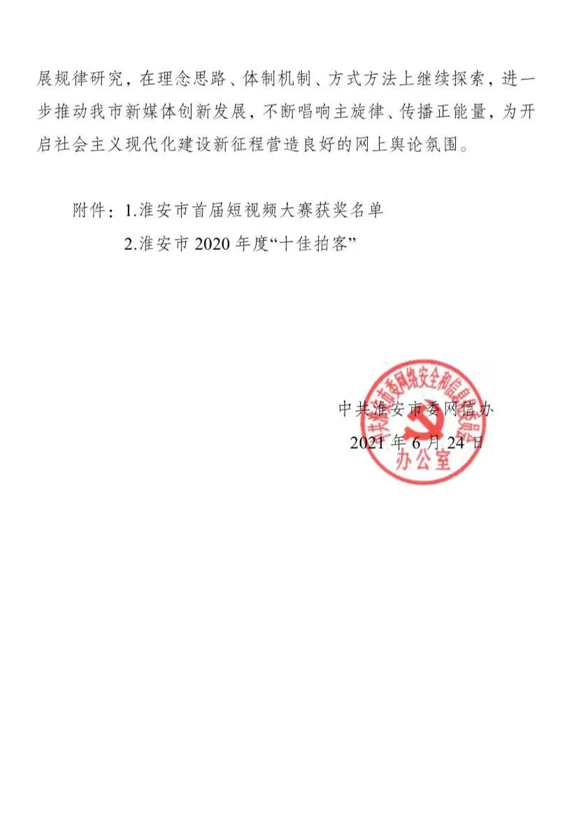 為宣傳貫徹落實(shí)習(xí)近平新時代中國特色社會主義思想,大力弘揚(yáng)社會主義核心價值觀,聚焦展示淮安高水平全面建成小康社會進(jìn)程中取得的重大成就,彰顯淮安建設(shè)“綠色高地 樞紐新城”的精彩風(fēng)貌,推動全市網(wǎng)絡(luò)傳播力提升,淮安市委網(wǎng)信辦于 2020 年11 月組織開展了淮安市首屆短視頻大賽評選活動。本次評選分為競賽單元“美麗淮安 幸福家園”和特別競賽單元“暖心淮”、“抗疫故事”。經(jīng)組織申報(bào)、初步評選、綜合評審,全市共有68 件作品獲得一、二、三等獎及優(yōu)秀獎。